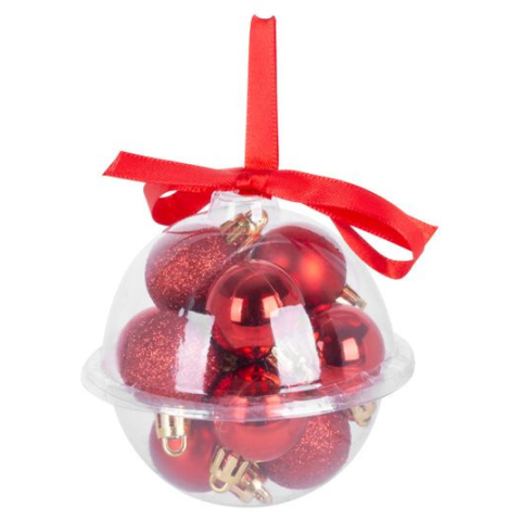 A karácsonyfa díszkészlet a karácsonyfa ünnepi díszítésére szolgál. 12 db 3 cm átméroju darabból álló karácsonyi gömbbol áll. A gömbök színe piros. Muanyagból készült.