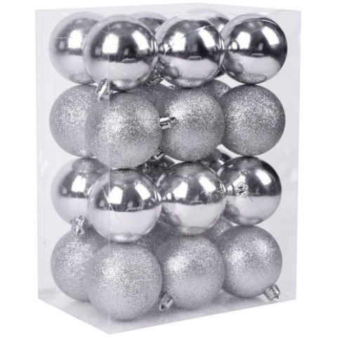 A karácsonyfa díszkészlet a karácsonyfa ünnepi díszítésére szolgál. 24 db 6 cm átméroju darabból álló karácsonyi gömbbol áll. A gömbök színe ezüst. Muanyagból készült.