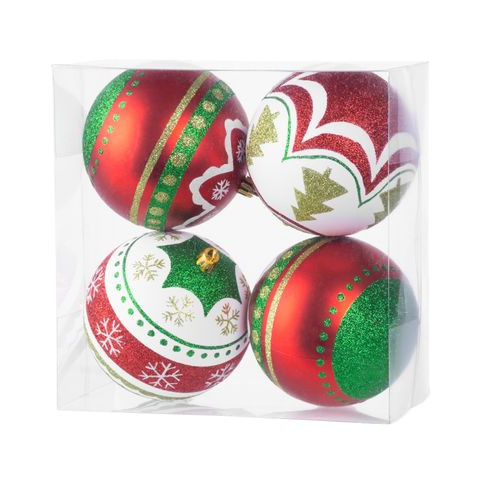 A karácsonyfa díszkészlet a karácsonyfa ünnepi díszítésére szolgál. 4 db díszített, egyenként 10 cm átméroju gömbbol áll. A gömbök színe piros-zöld. Muanyagból készült.