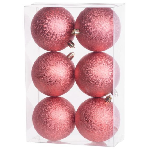 A karácsonyfa díszkészlet a karácsonyfa ünnepi díszítésére szolgál. 6 db 8 cm átméroju darabból álló karácsonyi gömbbol áll. A gömbök színe piros. Muanyagból készült.