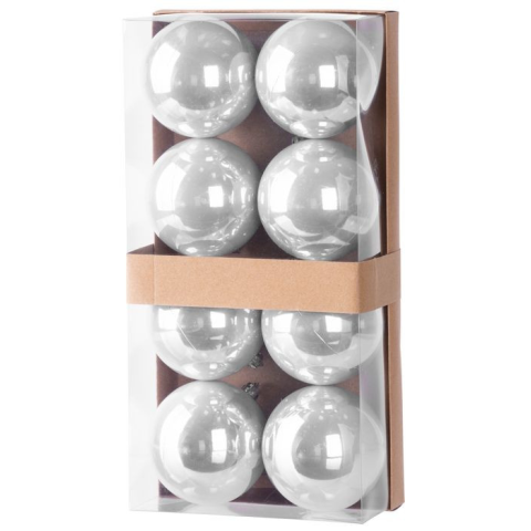 A karácsonyfa díszkészlet a karácsonyfa ünnepi díszítésére szolgál. 8 db 7 cm átméroju darabból álló karácsonyi gömbbol áll. A gömbök színe ezüst. Muanyagból készült.