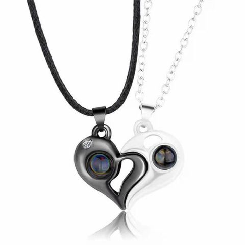 Páros mágneses nyaklánc szív medállal, amely a "szeretlek" szót vetíti ki több nyelven. Tökéletes romantikus ajándék pároknak