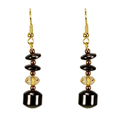 Elegáns, fekete-arany színű mágneses hematit fülbevaló arany színű kiegészítőkkel