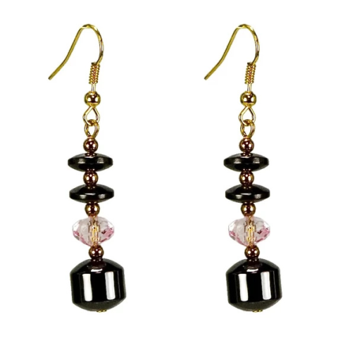 Elegáns, fekete-rózsaszín mágneses hematit fülbevaló arany színű kiegészítőkkel