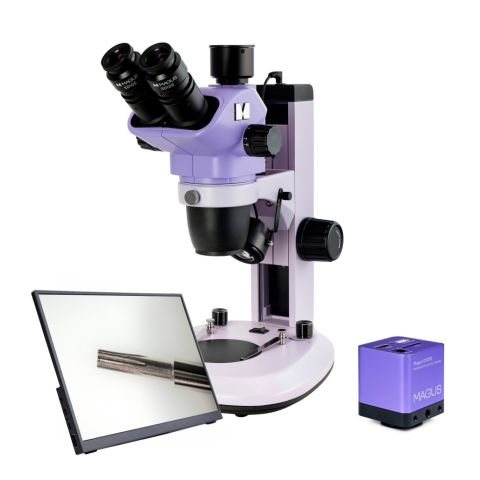 Kamerával és monitorral. Nagyítás: 6,7–45х. Greenough optikai kivitel. Háromszemlencsés mikroszkópfejrész, 3 W-os, áteső fényű LED megvilágítás, és 3 W-os, visszavert fényű, ferde LED megvilágítás A Greenough optikai kialakítású sztereomikroszkóp a fel