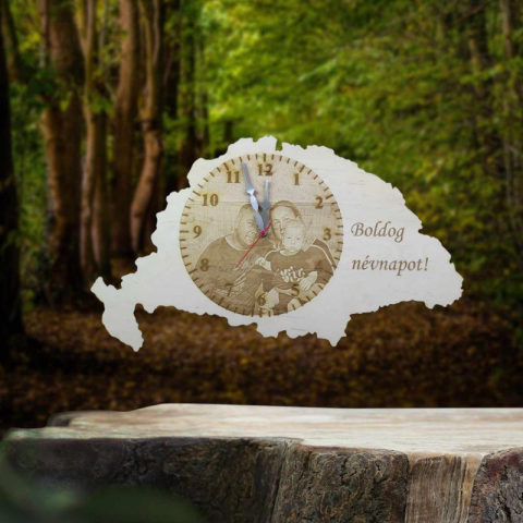 Gravírozott fa óra régi Magyarország térkép alapon. Mérete kb 64x38 cm. Fából készült gravírozott falióra Fedezze fel a stílusos időmérő művészetét ezzel a gyönyörű, fából készült faliórával! Ez a különleges darab nemcsak praktikus, hanem egyedi dek