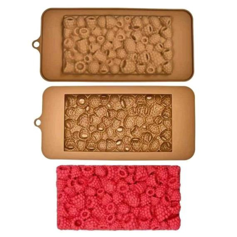 Málnákkal díszített, táblás csokoládé készítésére alkalmas, szilikon forma. A forma teljes mérete 22 cm x 10 cm x 0.8 cm