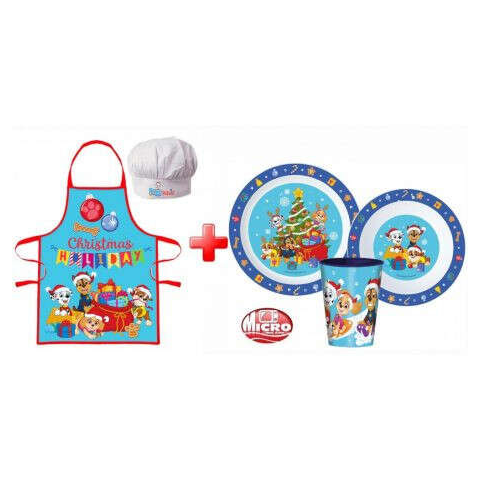 Paw Patrol, Mancs Őrjárat Karácsonyi kötény és műanyag étkészlet szettKötény anyaga: 100% poliészterTartalma: 1 db kötény + 1 db sapkaÉtkészlet anyaga: műanyagA készlet tartalma:1 db mélytálka (Mikrózható műanyag)1 db lapostányér (Mikrózható műanyag)1 db pohár 260 ml (600 watton mikrózható max. 2 percig)