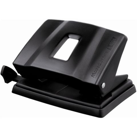 Lyukasztó, kétlyukú, 25 lap, fém, MAPED Essentials 25, fekete fém test, fekete matt bevonat letisztult dizájn és célszerűség kombinációja távtartó bemélyedés a konfettitartó tálcán a gyűrűskönyvek és emelőkaros iratrendezők fémszerkezetének odailleszté
