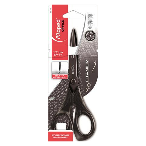 Olló, általános, 17 cm, MAPED Expert Titanium - titán bevonatú pengék a tartósabb élek és az optimális keménység érdekében - ergonomikus kialakítás: a nyél 3D-ben elforgatott, így tökéletesen illeszkedik a kéz vonalára - élethosszig tartó garancia: vág