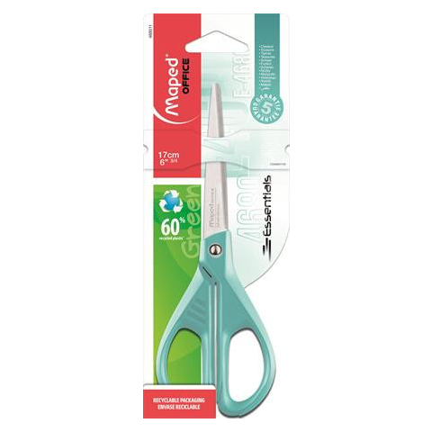 Olló, irodai, 17 cm, MAPED Essentials Green, türkizkék - ergonomikus és biztonságos kialakítás - lekerekített végekkel - bliszter csomagolás - zöld színben - 5 év garancia Gyártó/első EU forgalmazó elérhetősége: MAPED SAS 530 route de Pringy - 74370