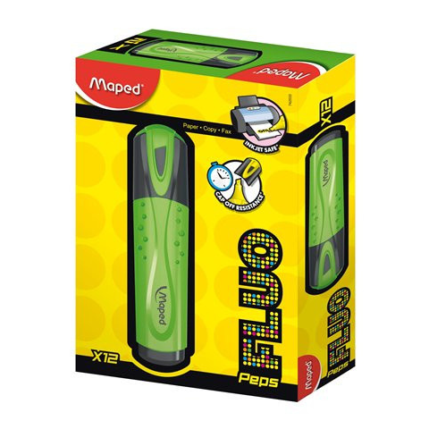 Szövegkiemelő, 1-5 mm, MAPED Fluo Peps Classic, zöld - vágott hegy - élénk színek - normál, fénymásoló- és faxpapírhoz is ajánlott - nem szárad be 4 óra után sem kupak nélkül - a tinta színével megegyező műanyag tolltest - klippel ellátott kupak - vona