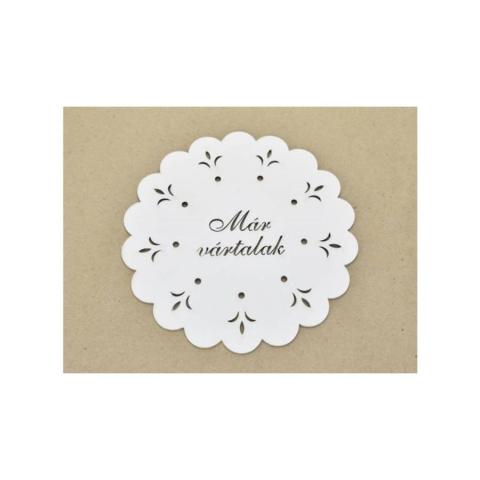 Fehér csipkemintás koszorúközép, 'Már vártalak' felirattal.