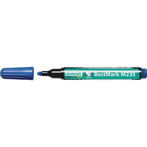Marker Stanger M235 permanent kerek kék Típus: M235 Hegy: kerek Írásvastagság: 1–3 mm Írásszín: kék permanent festékkel töltött marker alkoholbázisú műanyag, fém-, üveg- és fafelületekre