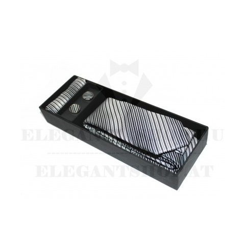 Dí,szdobozos slim nyakkendő szettA szett tartalmá,nak ö,sszes darabja tö,ké,letes ö,sszhangban van egymá,ssal, de kü,lö,n-kü,lö,n ,is kö,nnyen kombiná,lható, a ruhatá,r tö,bbi darabjá,val.Tartalma: nyakkendő, dí,szzsebkendő, mandzsetta gombAlapanyag: polié,szter mikró,szá,lMé,ret: Nyakkendő: 145 cm x 6 cm, Dí,szzsebkendő: 20 x 20 cmEleganciashop a youtube-on ,