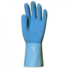 MÁRTOTT KÉK GUMIKESZTYŰ, ÉRDES, 30CM/1,3MM, VEGYSZERÁLLÓ_9 Pamut anyagra mártott kék latex védőkesztyű Csúszás elleni érdesített kézfejrész, 30 cm hosszú, Hosszú, hullámos mandzsetta