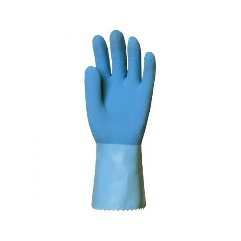 MÁRTOTT KÉK GUMIKESZTYŰ, ÉRDES, 30CM/1,3MM, VEGYSZERÁLLÓ_9 Pamut anyagra mártott kék latex védőkesztyű Csúszás elleni érdesített kézfejrész, 30 cm hosszú, Hosszú, hullámos mandzsetta