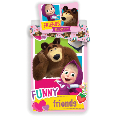 Mása és a Medve friends 2 részes pamut-vászon gyerek ágyneműA 100% pamutból készült ágyneműhuzat kiváló minőségű, könnyen kezelhető, anyaga formatartó, a színek nem fakulnak ki. Puha anyaga kellemes, pihentető érzést nyújt az alvás során. Ajánljuk azoknak a kedves vásárlóinknak, akik egy kitűnő minőségű, könnyen kezelhető ágyneműhuzatra vágynak.