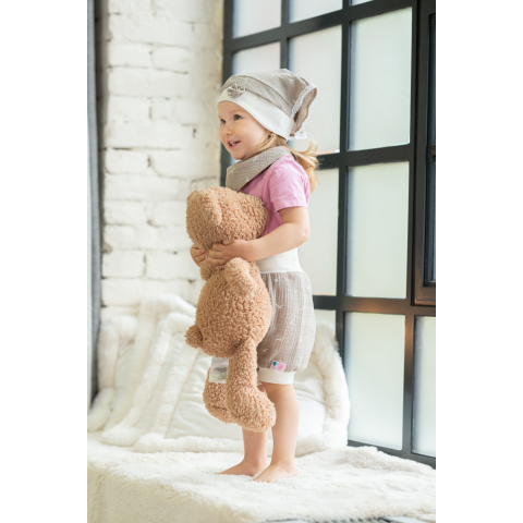 A PeggyBaby vékony, puha pamutanyagból készült hátul megköthető fejkendője, nemcsak kényelmes viselet, hanem a természet viszontagságaitól, a naptól és a széltől is megvédi a kicsik fejét. A tarkóvédő résznek köszönhetően strandra