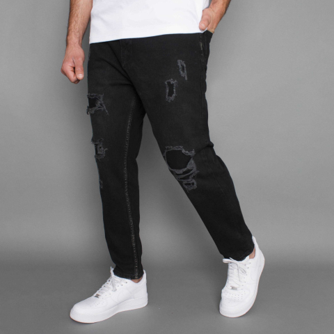 Tapered Fit, laza szabású fekete szaggatott és enyhén koptatott farmer, lefelé szűkülő fazon , zsebekkel és gombos sliccel Modell: 185 cm/ 85 kg/ 33-as méret