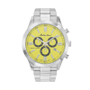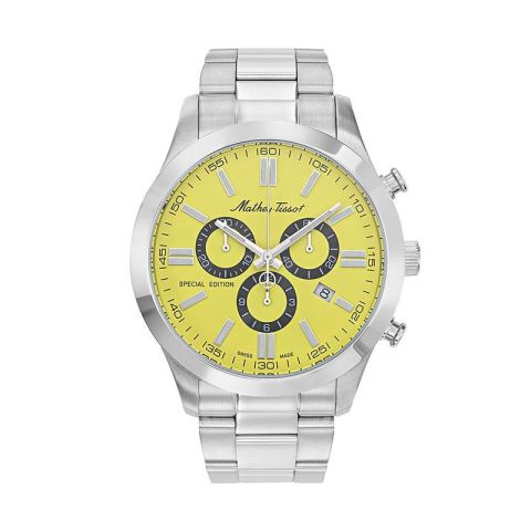 Kronográf 44mm-es nemesacél tokban, napfény sárga számlappal. SWISS MADE