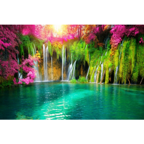 1 kép Matrica tapéta Cascada53 Vízesés az erdőben rózsaszín levelekkel, 250 x 150 cm