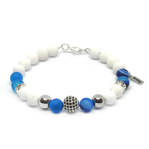 Figyelem! Nem szakad, nem nyúlik! Tartós ékszer. Az ékszer ásványai és tartozékai: – 8 mm-es matt kék Achát ásványok – 8 mm-es fehér matt Jade ásványok – 8 mm-es ezüst Hematit gyöngyök – Fekete köves strasszos pavé charm, kö