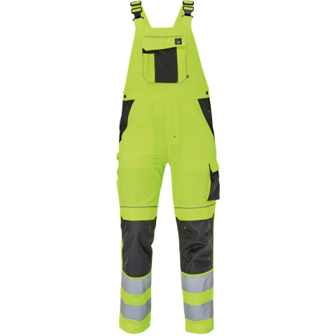 MAX VIVO HV mellesnadrág sárga 64 • férfi HI-VIS mellesnadrág rugalmas derékkal, széles pántokkal, műanyag csatokkal • 2 első zseb, 1 oldalzseb, 1 nagy mellzseb, 2 hátsó zseb • 2 kis hátsó zseb a jobb combon • nyomtatott 7,5 cm-es fényvisszavető csík a