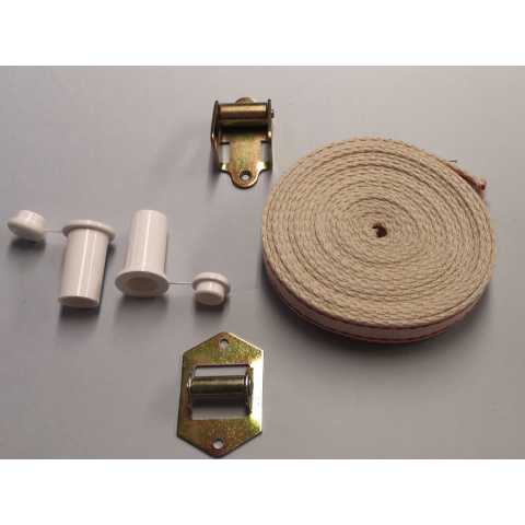Maxi felújítókészlet Maxi műanyag redőnyhöz, vagy fa redőnyhöz. Tartalma: 1 db maxi szorító (gurtni rögzítő), 5 méter maxi gurtni (22 mm), 1 db maxi fém bevezető, 2 db kupakos ütköző. Szállítási idő 2-3 munkanap.