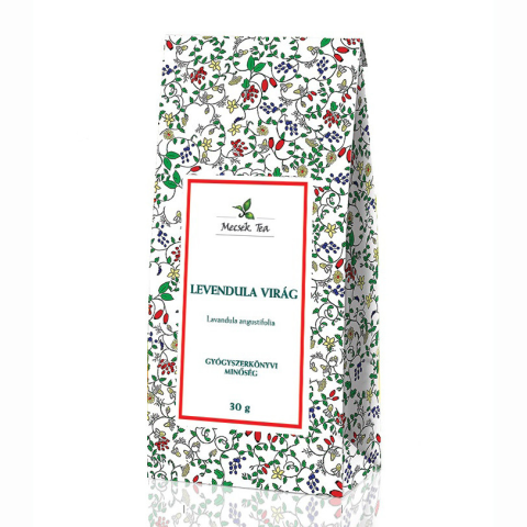 Levendula virág (Lavandula angustifolia) Leírás: „Teája enyhe nyugtató, görcsoldó, puffadáscsökkentő hatású. Külsőleg fürdőbe téve illatosító, meghűléskor párologtatásra légzéskönnyítés céljából alkalmazható. Szárítva párnába téve enyhe nyugtató, han