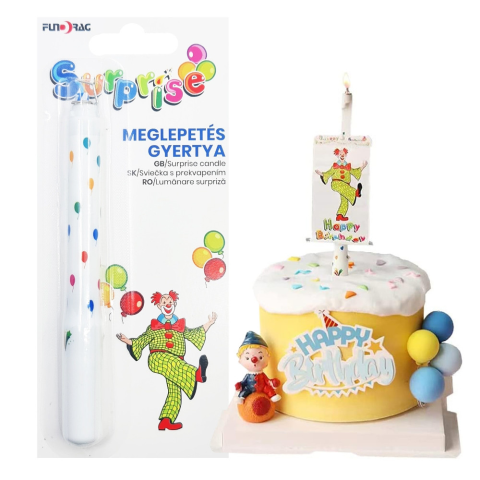Tedd felejthetetlenné a születésnapi ünneplést ezzel a különleges meglepetés gyertyával. A gyertya meggyújtásakor nemcsak a láng teszi ünnepivé a pillanatot, hanem egy váratlan, mókás meglepetés is: a gyertya belsejéből kiugrik egy vidám bohóc és a „Happy