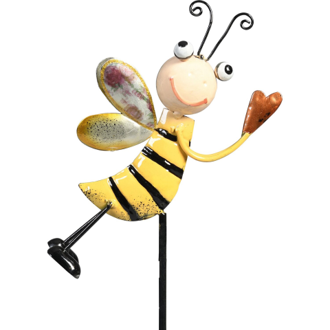 Az aranyos földbe szúrható dísszel a virágágyások vagy a virágládák dekorálhatók. Teraszra, balkonra vagy előkertbe helyezhető. A képen egy vicces méhecske látható, amely egy szívet visz, és barátságosan mosolyog a szemlélőre. Klasszikus sárga-fekete színösszeállításban készült, az arca pedig bézs színű. A földbe szúrható dísz időjárásálló fémből készült. Hosszú földbe szúrható tüskével rendelkezik, mérete ezáltal pedig 95 cm x 10 cm x 13 c