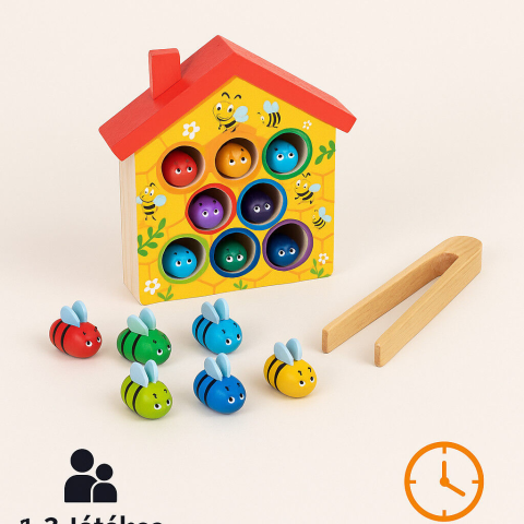 Honeybee egy szórakoztató és fejlesztő fa játék 3 éves kortól, amelyben a gyerekeknek színes méhecskéket kell a megfelelő színű kaptárlyukakba visszahelyezni. A játékhoz tartozik egy csipesz is, amivel a méhecskék megfoghatók – ez fejleszti a finommotorik