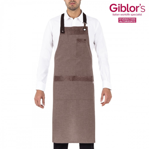 Barna színű, divatos melles kötény a méltán híres gasztro munkaruha gyártó, Olasz, Giblors company-től... A mellrészén egy kisebb zseb található tollaknak, a derekán egy 20 cm mély és 30cm széles nagyobb zseb van.
