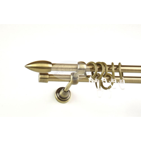 A MEMPHIS óarany színű, 240 cm-es, 2 rudas, fém karnis szett tartalma: 2 db 240 cm-es óarany fém karnisrúd 2 db Memphis típusú óarany színű fém végzáró 2 db Kansas típusú kis kupak végzáró 3 db falra szerelhető fém konzol 48 db óarany színű műanyag kar