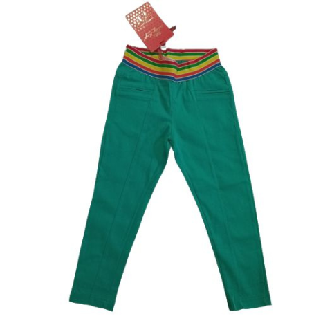 Ez a menta kislány vászon nadrág élénk színével és színes gumírozott derékrészével divatos és kényelmes viselet. A könnyű vászon anyag légáteresztő és puha, ideális mindennapi használatra, tökéletes választás óvodába, iskolába vagy szabadidős programokra.