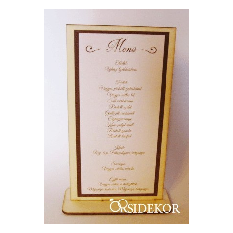 Igazi különlegesség kínálatunkban a talpas, fából készült menükártya. Bármilyen színben kérhető a grafika, így illeszkedik a dekoráció színéhez. Minden esetben letervezzük és átküldjük a grafikát az elképzelések alapján. Nincs