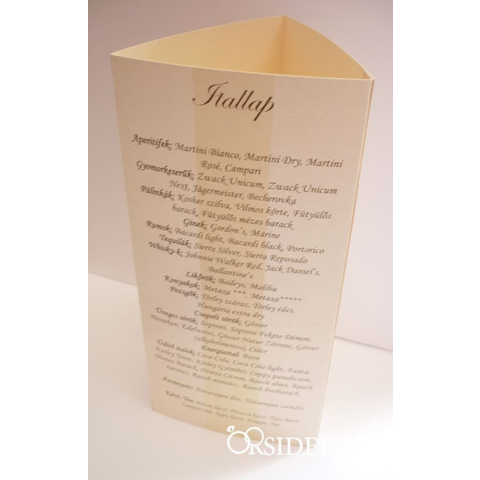 Ezt a háromszög formájú menüt 200 grammos papírból készítünk. A menü 3 oldalára az ételeken, italokon és asztalszámokon kívül a nevetek, a dátum és köszönő szöveg is nyomtatható. A menüháromszög a meghívókkal, az ültetőká