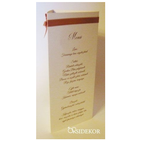 Ezt a háromszög formájú menükártyát 200 grammos papírból készítjük és szalaggal díszítünk. A szalag és a grafika színe választható. A menüháromszög a meghívókkal, az ültetőkártyákkal és ültetési renddel egységesen adják meg esküvőtök szín-és hangulatvilá