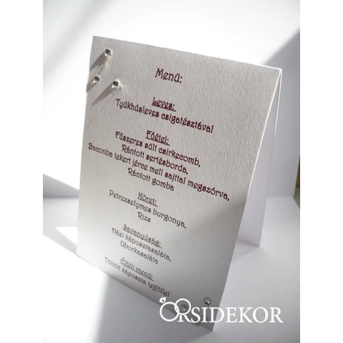 Igazi különlegesség kínálatunkban ez a menükártya, amely formáját tekintve nem mindennapi. Ezzel a kétoldalas menükártyával különleges hangulatot varázsolunk az ünnepi asztalra. A menükártya a meghívókkal, az ültetőkártyákkal és
