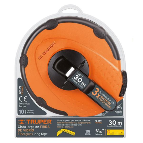 Ütésálló PVC borítás 3x gyorsabb visszatekerési sebesség Mindkét oldalon nyomtatott szalag Behajtható fogantyú Ideális az építőiparban és földmérésben Hossz: 30 m Szélesség: 14 mm TRUPER TP30ME Üvegszálas gyors csévélésű földmérő szalag, 30 m (12639) I