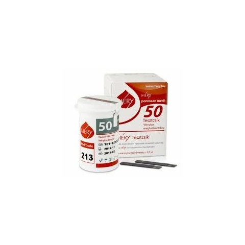 Vércukorszint önellenőrzésére szolgáló tesztcsík, mely kompatibilis a MÉRY PILLE, MÉRY ULTRA, MÉRY PLUSZ, MÉRY mini, MÉRY2 és MÉRY TD-4252 vércukormérő készülékekkel. A doboz 50 db tesztcsíkot tartalmaz.