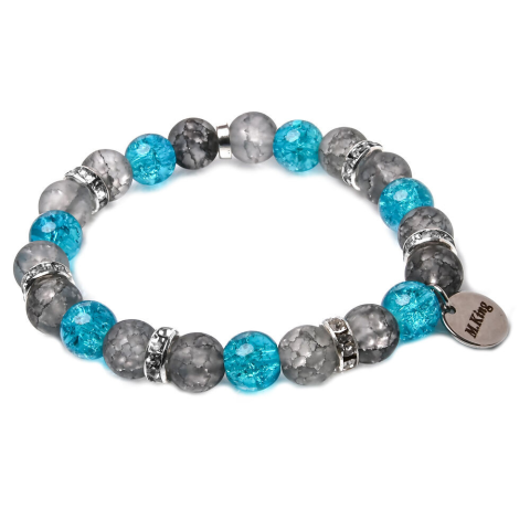 RUGALMAS KARKÖTŐ, a mérete választható.Az ékszer ásványai és tartozékai:– 8 mm-es szürke és kék roppantott hegyikristály gyöngyök– 8 mm-es strasszos fém díszek– Ezüst színű fém díszek– M.King márkajelzésű nemesacél logó