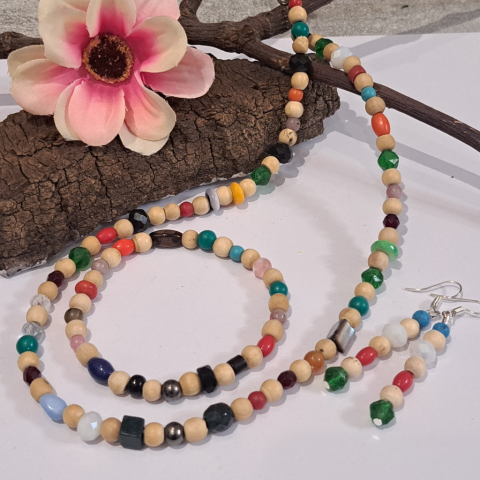 1 kép Mexicói szett, drágakő és fa nyaklánc + fülbevaló + karkötő