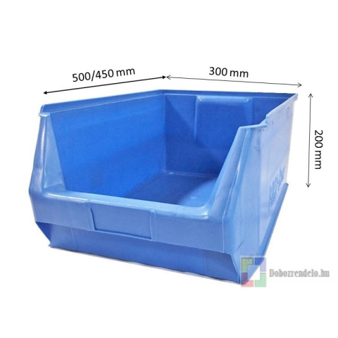 Tartós és kopásálló műanyagból készült tárolódobozok. Alkalmasak csavarok, apró alkatrészek, szerszámok tárolására. Sav - és lúgálló anyagból készülnek. Mérete (mm): 500/450x300x200 Űrtartalma (liter): 30 Tömege (gramm): 1 100 Max.terhelhetősége (kg): 240