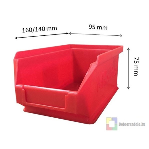 Tartós és kopásálló műanyagból készült tárolódobozok. Alkalmasak csavarok, apró alkatrészek, szerszámok tárolására. Sav - és lúgálló anyagból készülnek. Mérete (mm): 160/140x95x75 - Űrtartalma (liter): 1 - Tömege (gramm): 94 - Max.terhelhetősége (kg): 30