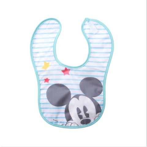 Vidám Mickey figurás baba előke, igaz kis legényeknek! Anyaga: belső oldala 100% pamut, külső oldala lágyítot PVC. Mérete: kb 31x26 cm