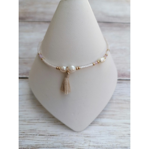 MIGI Pearl bojtos karkötőtő a kifinomult stílus kedvelőinek. Egyedi kézzel készített nyàri minimál karkötő. A karkötő magas minőségű Miyuki és Delica gyöngyök és Tenyésztettgyöngy felhasználásával készült. A karkötőt egy apró BIGI's bilèta teszi