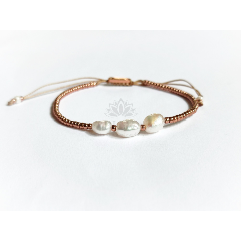 MIGI Pearl Trio karkötőtő a kifinomult stílus kedvelőinek. Rosé gold színben Egyedi kézzel készített minimál karkötő. A karkötő magas minőségű Miyuki gyöngyök ès 3db Tenyésztett gyöngy felhasználásával kèszült. A karkötőt egy apró BIGI's bilèta