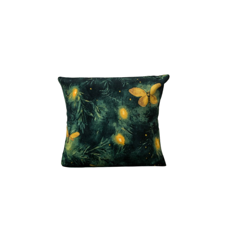 A Mikroplüss párnahuzat YELLOW BUTTERFLY 45x45 cm, sötétzöld varázslatos hangulatot hoz a belső térbe a sötétzöld háttérrel és a finom ágacskák, fények és sárga pillangók motívumaival.